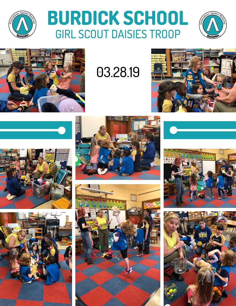 Generations Against Bullying (GAB), Linda Lee presented to the Girl Scout Troop, Daisies 10672 at Burdick School. This was a wonderful opportunity to introduce the new terms of Upstander vs bystander.