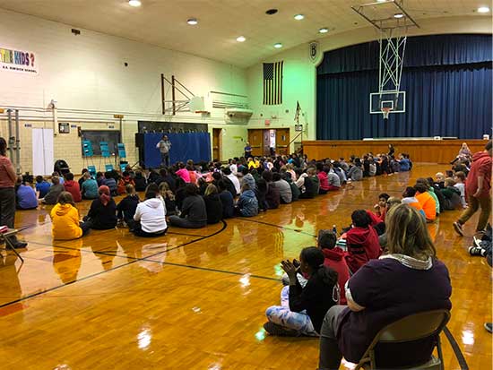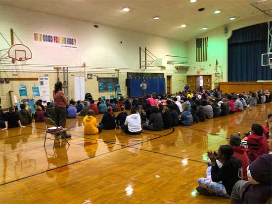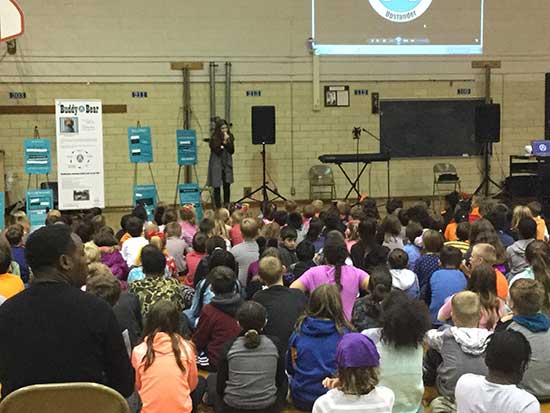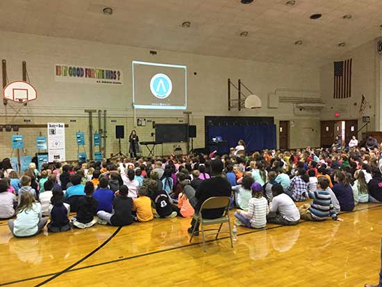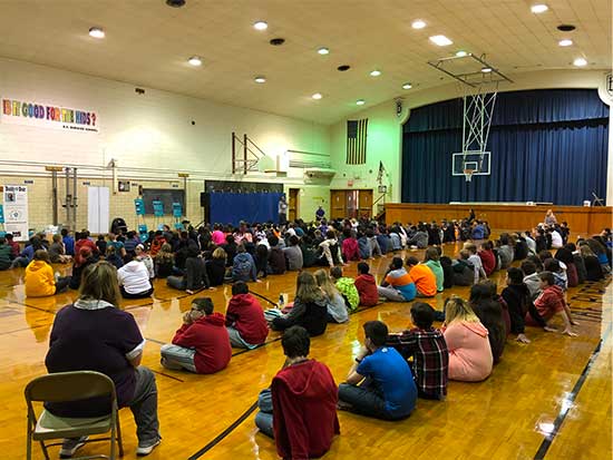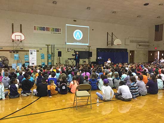 Our first assembly was with the middle school students, who got to meet with and hear Mike Turner’s motivational life story about how he turned his life from that of a bullying victim, then a bully and gang leader, into a successful business owner and public speaker. Mike empowered them to become Upstanders, and Linda Lee did an exercise with them to help them focus on the good in their lives instead of the bad. Then, the primary students came in to hear Franki Moscato’s story and listen to her sing the songs she’s composed. What a powerful performance and we wish her success with her efforts to get on American Idol!